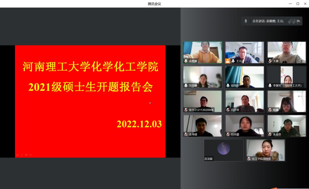 为贯彻落实我校“育人为本,崇尚学术”的办学理念,切实做好研究生学位论文指导工作,根据学校、学院相关工作要求,结合当前疫情防控现状,我院于2022年12月1日-5日期间组织开展了2021级硕士研究生学位论文开题答辩会,答辩会以腾讯会议形式线上召开。