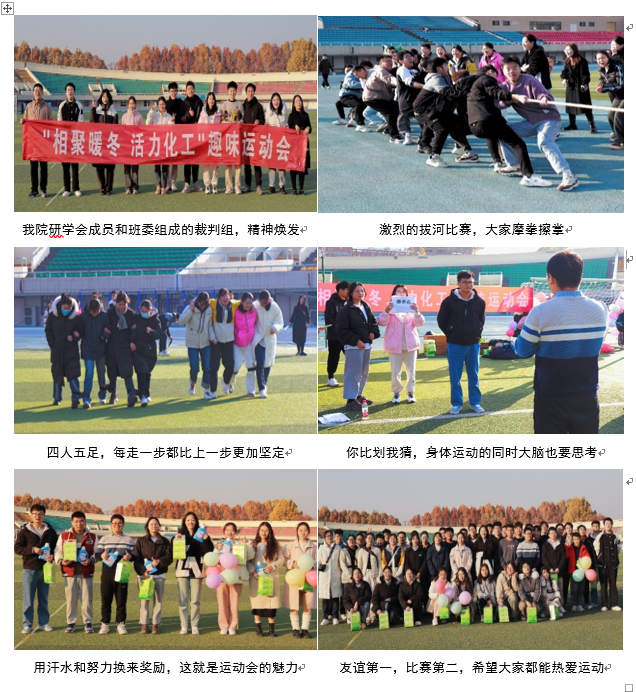 为丰富我院研究生的课余文化生活,增强健身锻炼意识,提高团队协作能力,我院于11月26日下午在东区体育场举办了“相聚暖冬、活力化工”趣味运动会。此次活动由我院研究生会文体部组织开展,共有80余名研究生报名参加,充分展现了我院研究生积极向上、勇于追求的精神风貌。