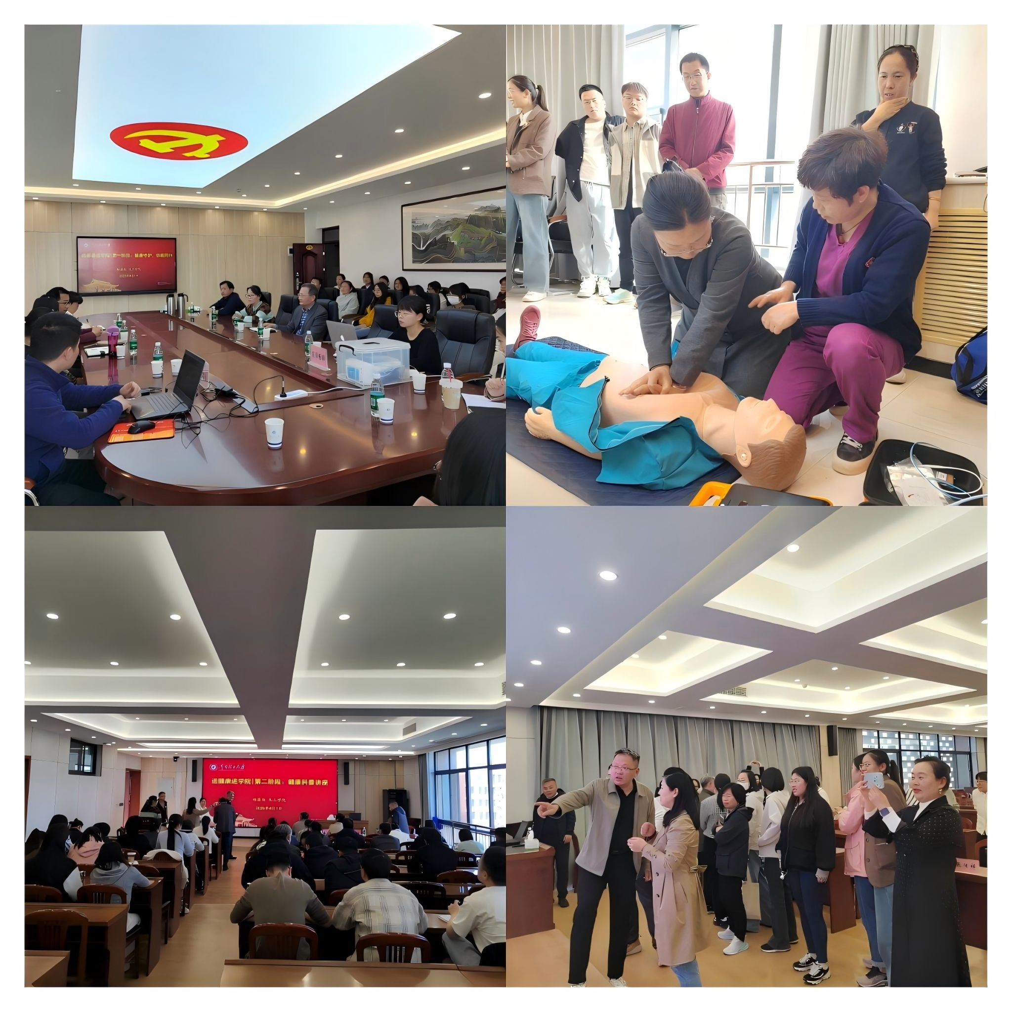 下午14:30,活动在化工学院511会议室正式启动。校医院为师生提供了急救技能培训、医保报销和体检报告解读三大服务。急救技能实战培训环节,医护人员通过讲解和示范,传授心肺复苏、海姆立克急救等技能,并组织实战演练,确保每位参与者掌握关键急救技能,增强了大家的急救意识和能力。在医保报销环节,工作人员详细介绍了报销范围、流程及注意事项,并现场解答疑问,提供材料准备指导和收集服务,简化了报销流程。体检报告解读咨询区也吸引了师生。专业医师耐心解读报告,解答指标异常原因,并提供个性化健康指导,包括饮食、运动建议,帮助师生更好地管理健康。