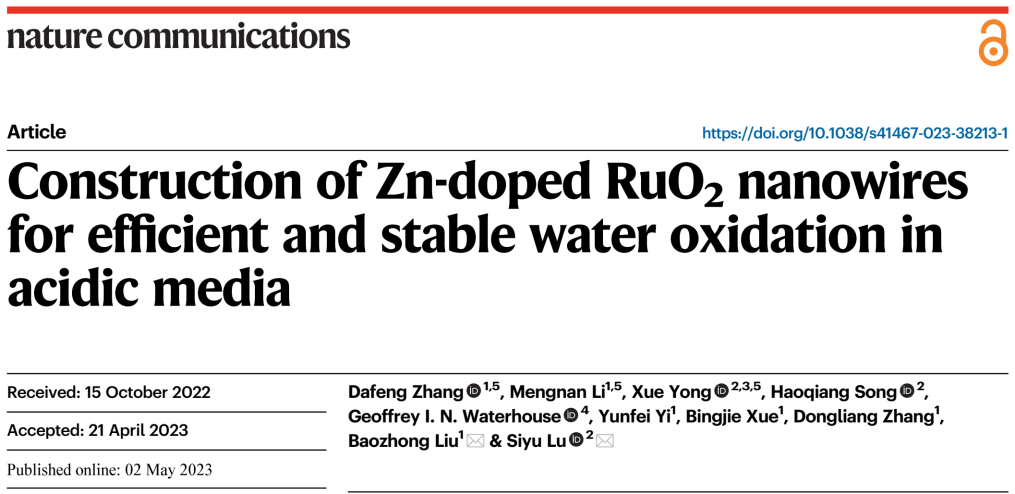 近日,我院教师张大峰博士与英国谢菲尔德大学雍雪博士、郑州大学卢思宇教授合作在国际著名期刊《Nature Communications》(中科院一区top期刊,Nature Index期刊,影响因子:17.694)发表题为《酸性介质中高效稳定催化水氧化的锌掺杂二氧化钌纳米线的构筑》(《Construction of Zn-doped RuO2 nanowires for efficient and stable water oxidation in acidic media》)的研究成果。