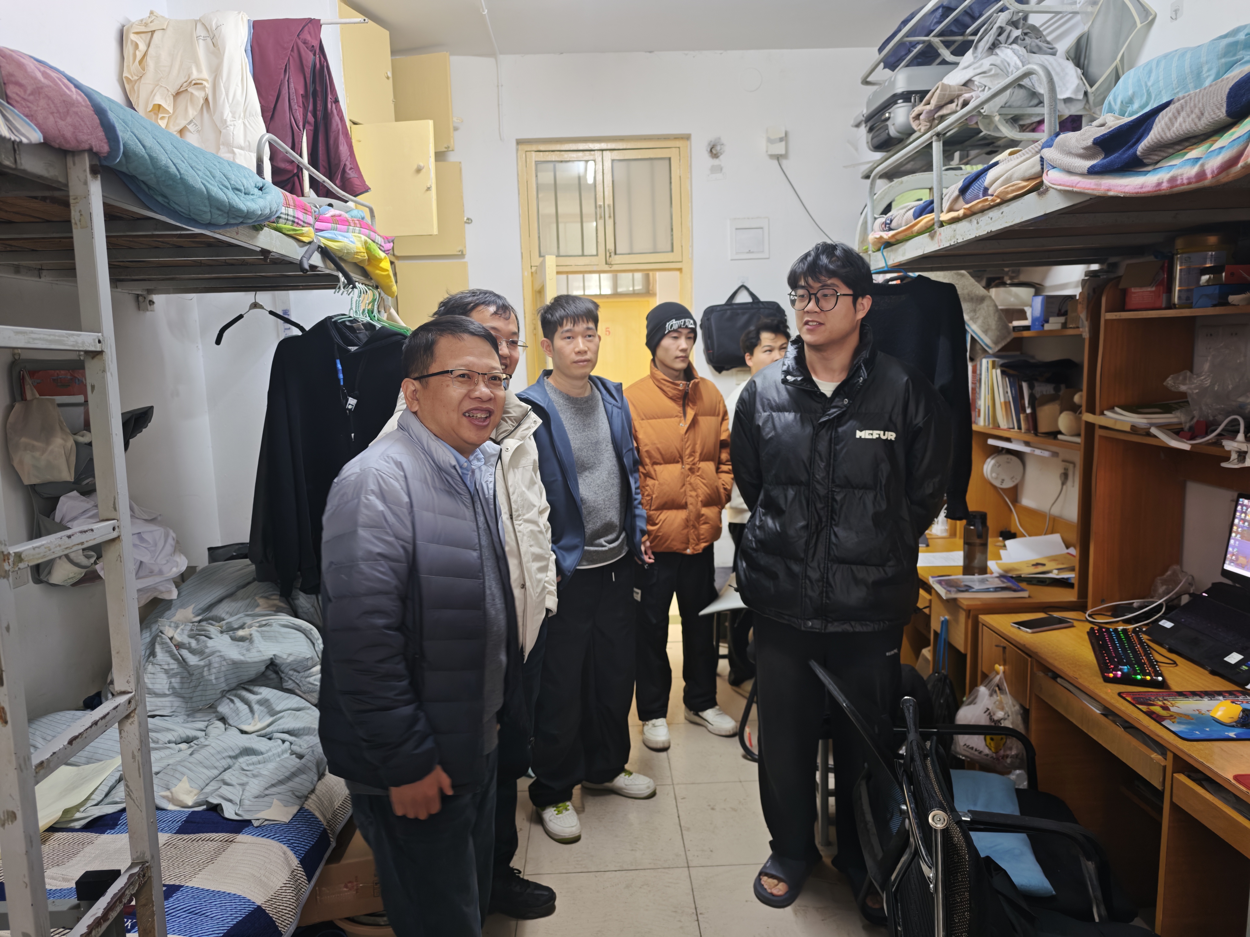 检查组重点排查违规使用大功率电器、私拉乱接电线、插排违规摆放等用电安全问题,同时排查易燃易爆物品、管制刀具等违禁物品。排查过程中,领导老师与同学们亲切交流,详细询问期末复习进度与生活需求,结合冬季安全特点和化工专业特性,现场讲解火灾应急逃生技巧,反复强调“人走电断、禁用违规电器”的安全准则,提醒同学们兼顾备考效率与住宿安全。