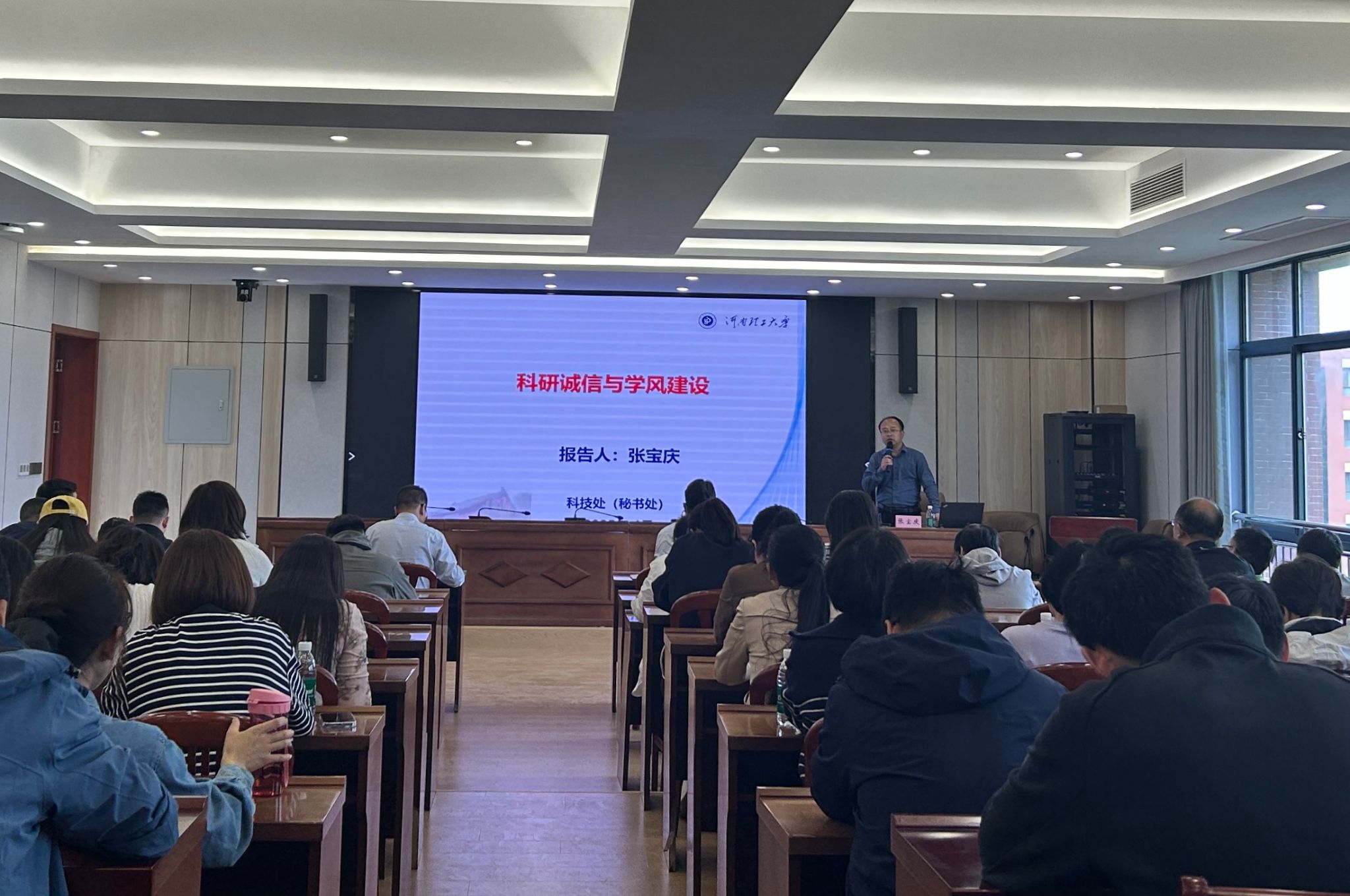 4月15日,校学术委员会秘书处主任、科技处副处长张宝庆受邀来我院507会议室作《科研诚信与学风建设》报告,会议由学院副院长邢宝林主持,副院长范云场列席参会,全院教师参加会议。