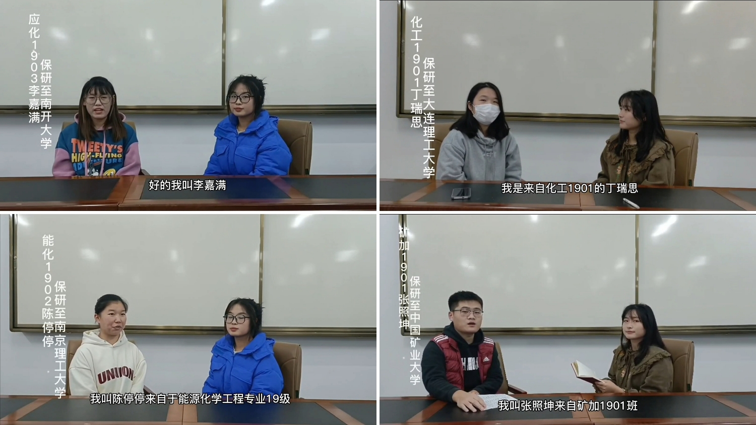 下午二时,我院宣传中心长期志愿者在指定教室集合,对此次采访工作做了准备工作。此次采访由我院宣传中心长期志愿者贺寒夕和杨忠湘担任采访者,对四名保研的同学进行采访。在一切准备工作完成后,采访正式开始。第一位受采访者是来自能源化学专业1902班的陈停停,保研至南京理工大学,陈停停主要讲述了自己的日常学习的经验和解决焦虑的方法,并鼓励学弟学妹们在大学期间多参加竞赛活动丰富自己的学习以及课外生活。第二位受采访者是来自应用化学专业1903班的李嘉满,保研至南开大学,针对如何在保研的过程中提高自己的竞争力,她给出了自己的建议,同时她也鼓励学弟学妹们多多参加学生工作,锻炼自己的能力,充实自己的生活。第三位受采访者是来自矿物加工工程专业1901班的张照坤,保研至中国矿业大学,在采访过程中,张照坤着重对大学的一些竞赛活动分享了自己的参赛经验,并鼓励学弟学妹们要尽早找到适合自己的道路,明确自己的奋斗目标,并为之努力。第四位受采访者是来自化学工程与工艺专业1901班的丁瑞思,保研至大连理工大学,她鼓励学弟学妹们在大一到大三这段时期在提升自己专业课的成绩的同时,也要培养自己的兴趣爱好,丰富自己的经历,锻炼自己的各项技能,使自己综合全面的发展。