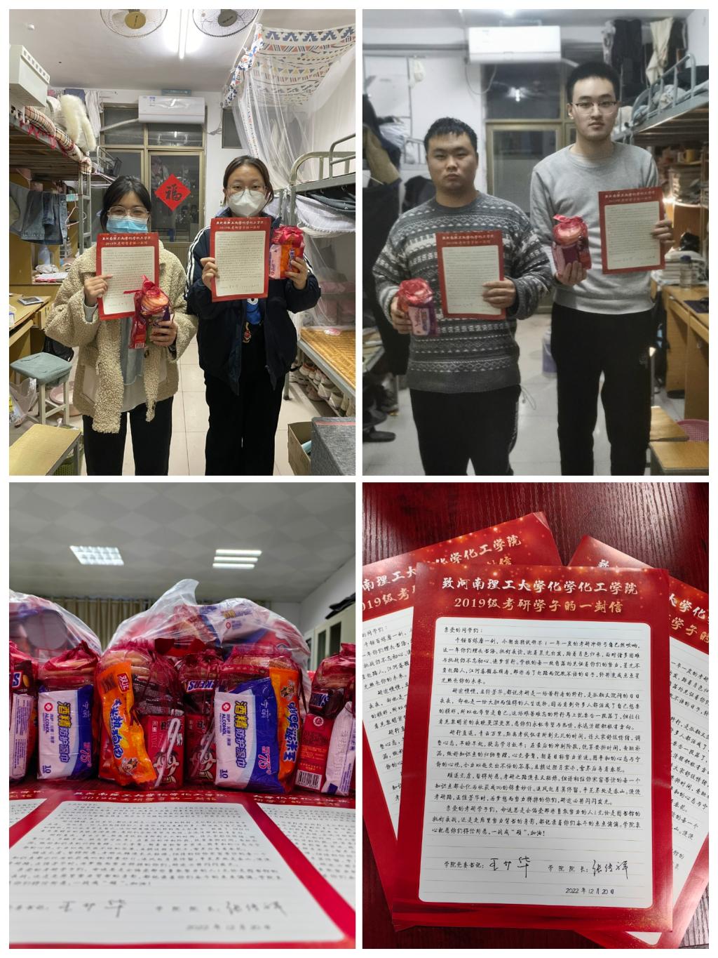 走访过程中,我院领导和学生们亲切交流,肯定了同学们为考研所付出的努力,关切询问同学们的复习进度、心理状态以及身体情况,叮嘱同学们近来要注意保暖、注意营养、注意劳逸结合,为最后一战保持良好的身体素质与心理状态。同时提醒同学们要熟知考点、考试注意事项以及考试技巧等问题,做好考前准备,放平心态,鼓励同学们要坚定信心,积极调整身心状态,用饱满的精神姿态迎接考试,并寄语广大考研学子自信迎考、沉着应考、顺利赢考。随后我院领导为考研学子分发“考研大礼包”和“致考研学子的一封信”,以笔笺心,以书传情,信中“千锤百炼磨一剑”“星光不负赶路人”都是对考研学子们经历百难而必将取得善果的肯定和激励。腊月寒冬终会过,雪尽后再看春花。贴心的礼物,温情的叮咛,真切的祝愿,让身处紧张备考状态的考研学子深深感受到来自学院的关爱与温暖,他们纷纷表示将带着老师们的关怀和祝福,全力以赴,用优异的成绩为学院争光添彩。