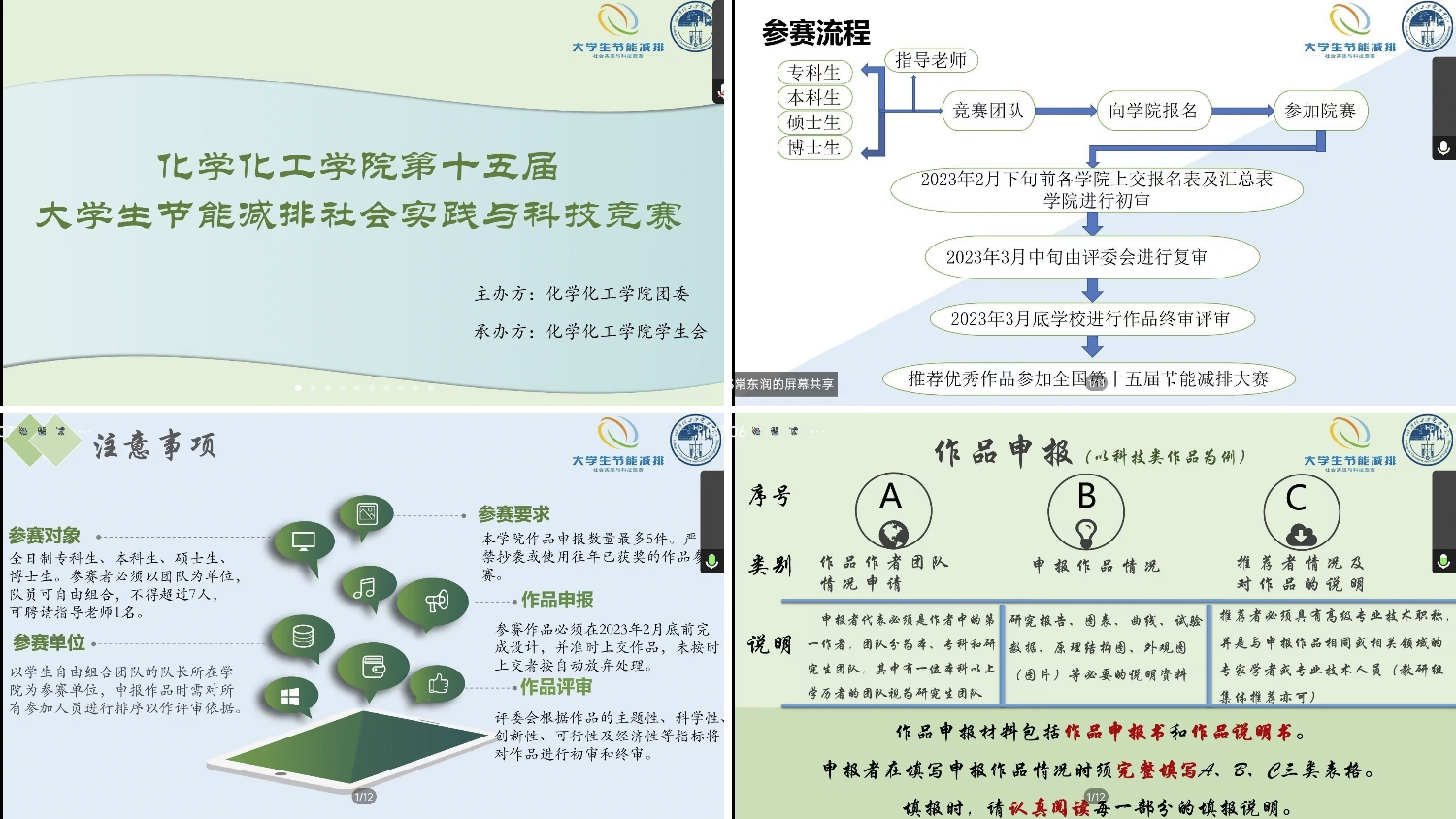 为进一步加强节能减排相关知识的宣传,增强我院学生节能环保意识与科技创新意识,提高我院学生工程实践能力、社会调查能力和团队协作能力,我院于12月28日下午依托腾讯会议平台举办第十五届大学生节能减排社会实践与科技竞赛宣介会。本次会议由我院学生会科创学习部长期志愿者闫干主持,往届优秀获奖学生代表和各级学生代表参加会议。