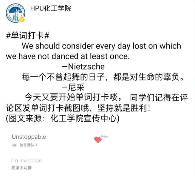为进一步加强我院学风建设,营造优良的学习氛围,培养我院学生坚持不懈,持之以恒的学习习惯,激发我院学生学习英语的热情,夯实英语基础,提升我院学生的英语水平,引导同学们积极备战大学英语四、六级考试,我院组织开展了化工学院第一届英语单词打卡大赛。