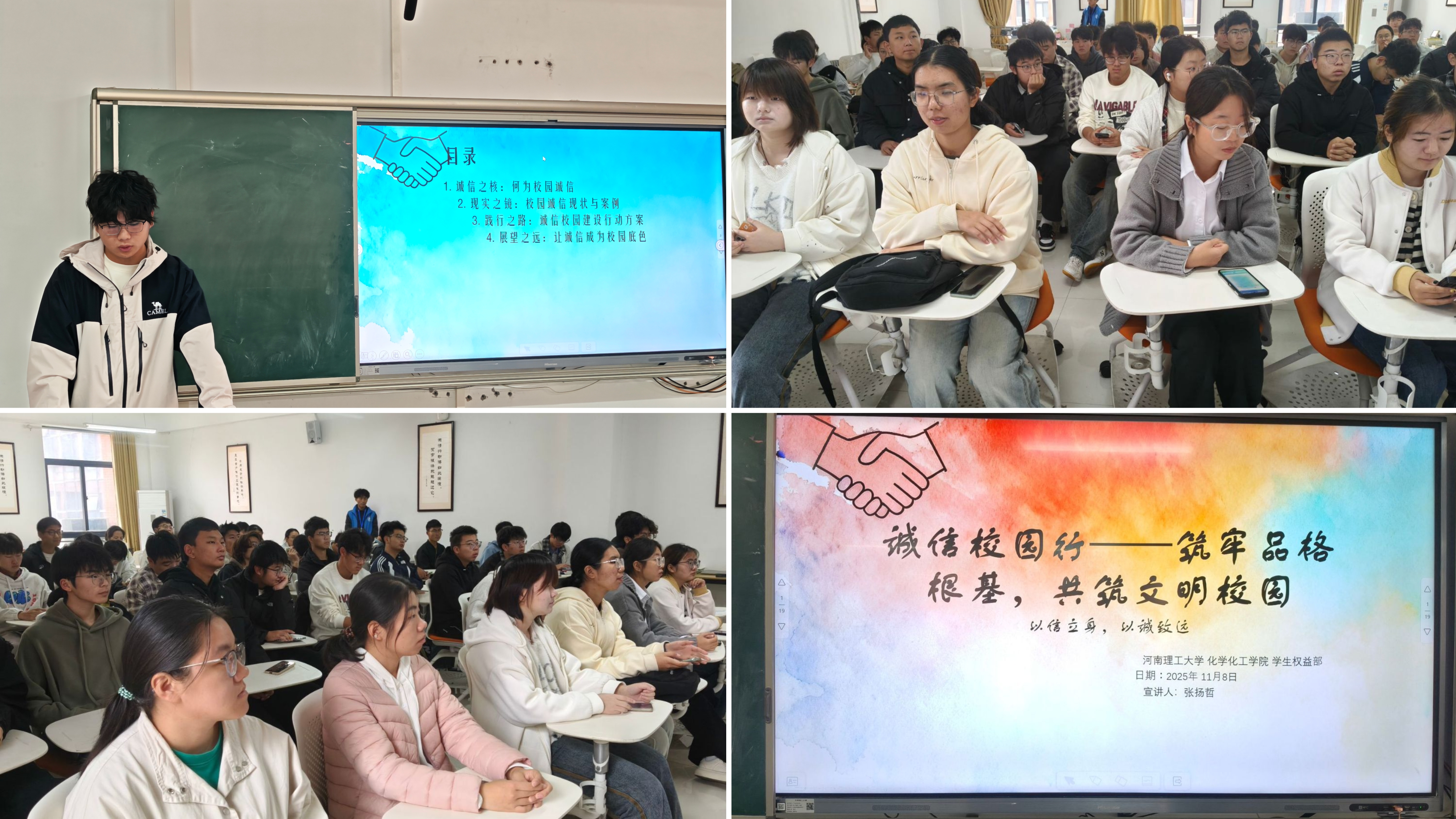 活动由诚信之核、现实之镜、践行之路、展望之远四个模块组成,分别从何为校园诚信、校园诚信现状与案例、诚信校园建设行动方案、让诚信成为校园底色四个方面全面剖析了诚信的重要性及意义。宣讲人在每个模块都配备了实际案例以及视频,旨在让大一新生能够真切认识到诚信的作用与不可替代性。此外,我院积极推动诚信教育融入日常教学,将其系统纳入思政课、道德与法治等课程体系,并结合经典案例解析与法律条文解读,开展专题教学与实践赋能活动。例如,举办诚信故事分享会、主题辩论赛、书画展,组织学生观看诚信教育影片,邀请诚信榜样进校园开展宣讲等。通过一系列的榜样示范工程,以榜样力量引领广大学生践行诚信准则,推动校园内“人人讲诚信,事事讲诚信”的良好氛围。