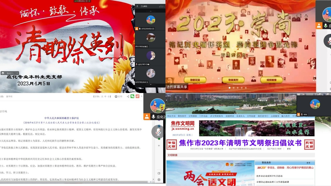 本次活动以线上的形式开展。活动伊始,党支部成员共同学习了《中华人民共和国英雄烈士保护法》,号召同学们崇尚、学习、捍卫烈士英雄,进一步认识到保护英雄烈士名誉和荣誉的必要性和重要性。随后,党支部成员通过中华英烈网进行线上祭扫,为英雄烈士鲜花鞠躬,向着为解放中华民族、建设祖国事业而英勇献身的革命先烈们致以崇高的敬意和深切的哀悼。党支部成员慎终追远,缅怀过去,告慰英魂,并在活动最后进行发言,表达自己继承革命先辈遗志,踔厉奋发、砥砺前行的决心,将英烈精神入脑入心,勤奋学习,以实际行动回馈社会,报效国家。