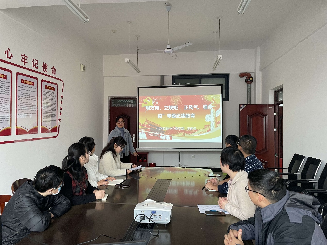 为推动学习贯彻习近平新时代中国特色社会主义思想主题教育走深走实,全面加强党的纪律建设,根据学校《在全校党员干部中开展学“明方向、立规矩、正风气、强免疫”专题纪律教育的工作方案》要求,11月7日下午,化学实验中心党支部在综合楼613开展书记讲党课——“明方向、立规矩、正风气、强免疫”专题纪律教育,支部书记李彦伟同志为全体党员上了一堂生动的纪法课。