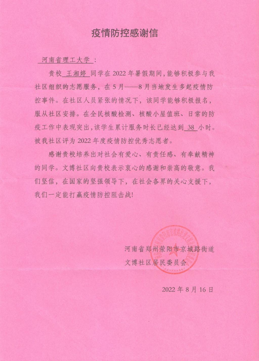 近日,学院党委收到河南省荥阳市京城路街道文博社区居民委员会的《疫情防控感谢信》,信中对我院应用化学专业2002班学生王湘婷积极响应社区号召,弘扬“奉献、友爱、互助、进步”的志愿精神,积极投身社区疫情防控工作表示感谢与赞扬。