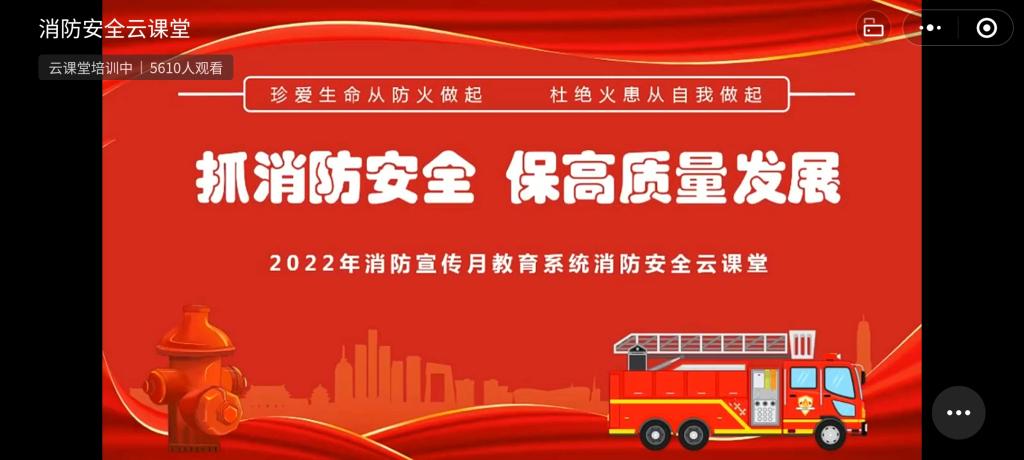 为进一步提升师生的消防安全意识,提高火灾抵御能力,做好消防安全知识宣传工作,11月19日晚,学院组织师生参加2022年消防宣传月教育系统消防安全云课堂活动,活动主题为“抓消防安全,保质量发展”。
