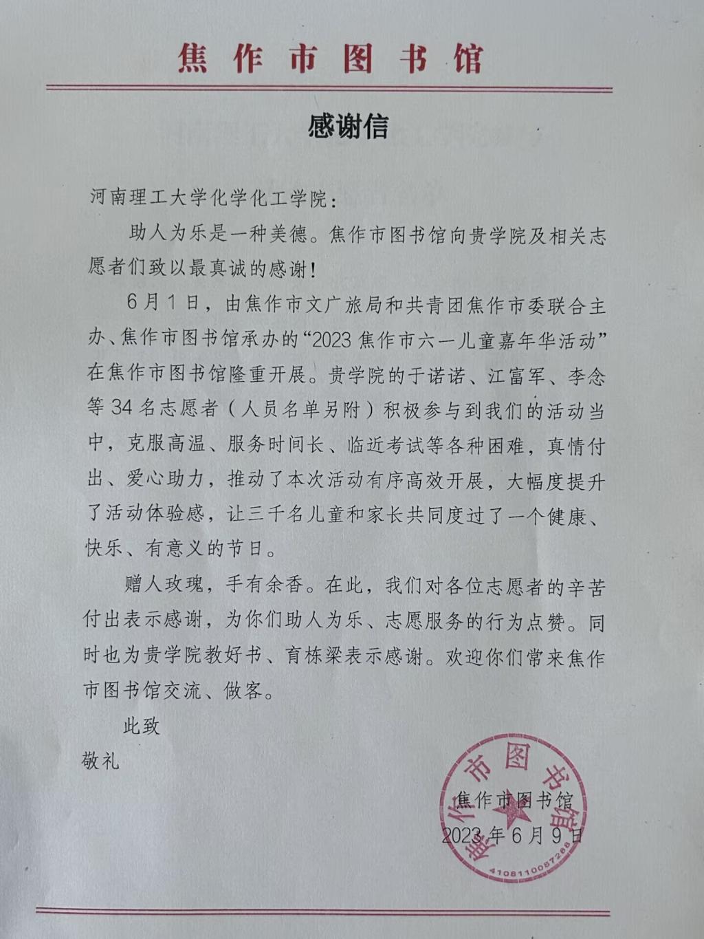 “助人为乐是一种美德”。6月9日,我院收到了一封来自焦作市图书馆的感谢信,信中对我院于6月1日在“2023焦作市六一儿童嘉年华活动”中的志愿工作给予了充分的肯定,向我院参加本次活动的志愿者们表达了真诚的感谢。