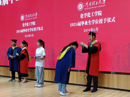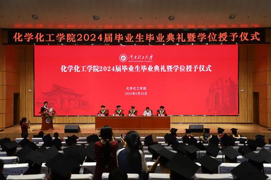 6月20日上午十点,伴随着庄重的国歌,我院2024届毕业典礼正式开始。应用化学系毕业生刘冰洁作为优秀学生代表上台发言,她代表全体2024届毕业生向辛勤付出的老师们表达最真挚的感谢和对母校的眷恋与不舍,同时她表示将继续坚定理想,不负韶华,用实际行动回报学校的悉心栽培。教师代表史长亮代表学院全体教师向毕业生们表达了衷心的祝福与祝愿,鼓励毕业生们心怀梦想,敢于拼搏,微笑面对困难与挑战,争做国之栋梁。优秀校友代表王重庆发言,他向即将毕业的学弟学妹们表达诚挚的祝福,希望同学们在未来的征途中能够灵活运用大学中收获的经验,保持好奇心,不惧困难,坚定理想,在探索中不断进步,为母校的建设增光添彩。
