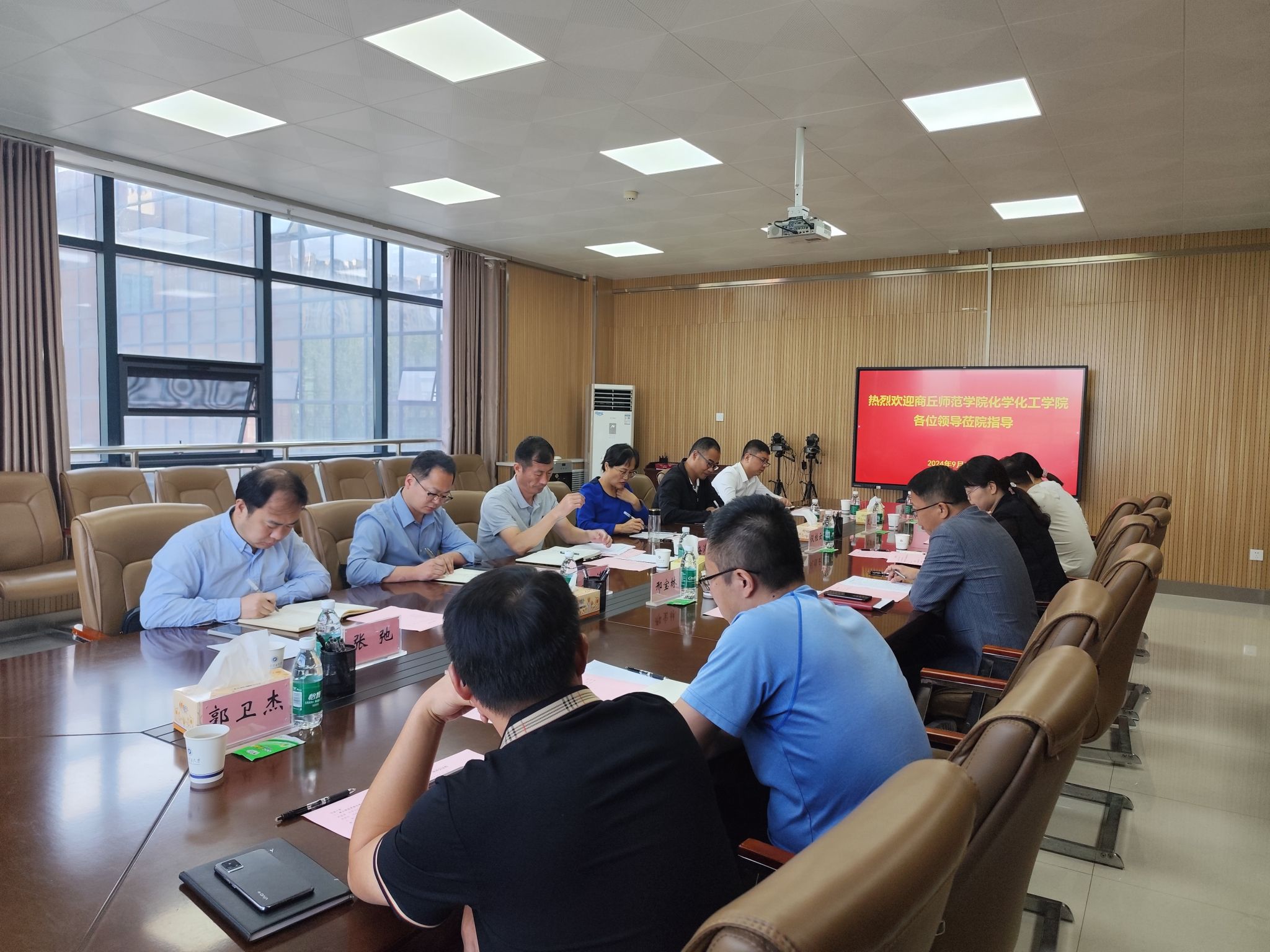 仪桂云介绍与会人员,对商丘师范学院的来院交流表示热烈欢迎。刘宝忠致欢迎辞,并就学院的发展历史和目前学院学科、科研工作情况进行了详细汇报。李海涛书记对学院近年来的办学成绩表示肯定,之后介绍了商丘师范学院化学化工学院的发展情况和专业特色,并期望以此为契机,进一步加强交流、密切联系。之后,双方人员围绕学科建设、专业调整、科研项目合作和人才培养等工作进行了深入交流。