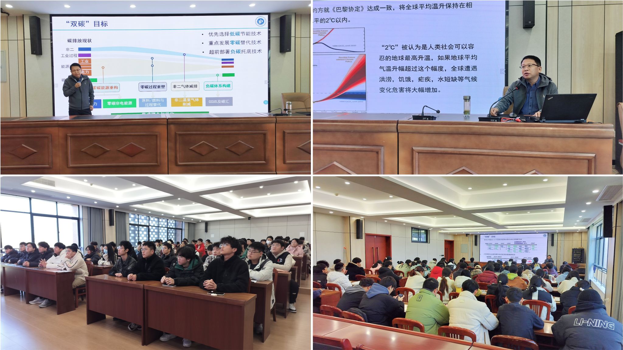 授课中,刘宝忠从全球气候变化问题切入,引入碳排放的问题,并简要阐述了我国作出2030年前碳达峰、2060年前碳中和的目标和国家重要部署。随后,他围绕“双碳”行动,从三个方面进行阐述,一是“双碳”行动形势迫在眉睫,气候变化形势日趋紧迫,我国积极应对并上升到国家战略;二是“双碳”行动基础不断夯实,体现在能源利用的高效革命,能源系统的清洁低碳革命,氢能和储能等技术加快发展,绿色低碳循环发展深入推进,生态环境越来越好等方面;三是“双碳”行动发展坚定不移,坚持推动发展向绿色转型,创新低碳科技与应用,提高绿色低碳发展水平。最后,刘宝忠勉励学生在生活中践行绿色理念,在学习上充分发挥自己的专业价值,为国家实现碳达峰、碳中和目标做出自己的贡献。