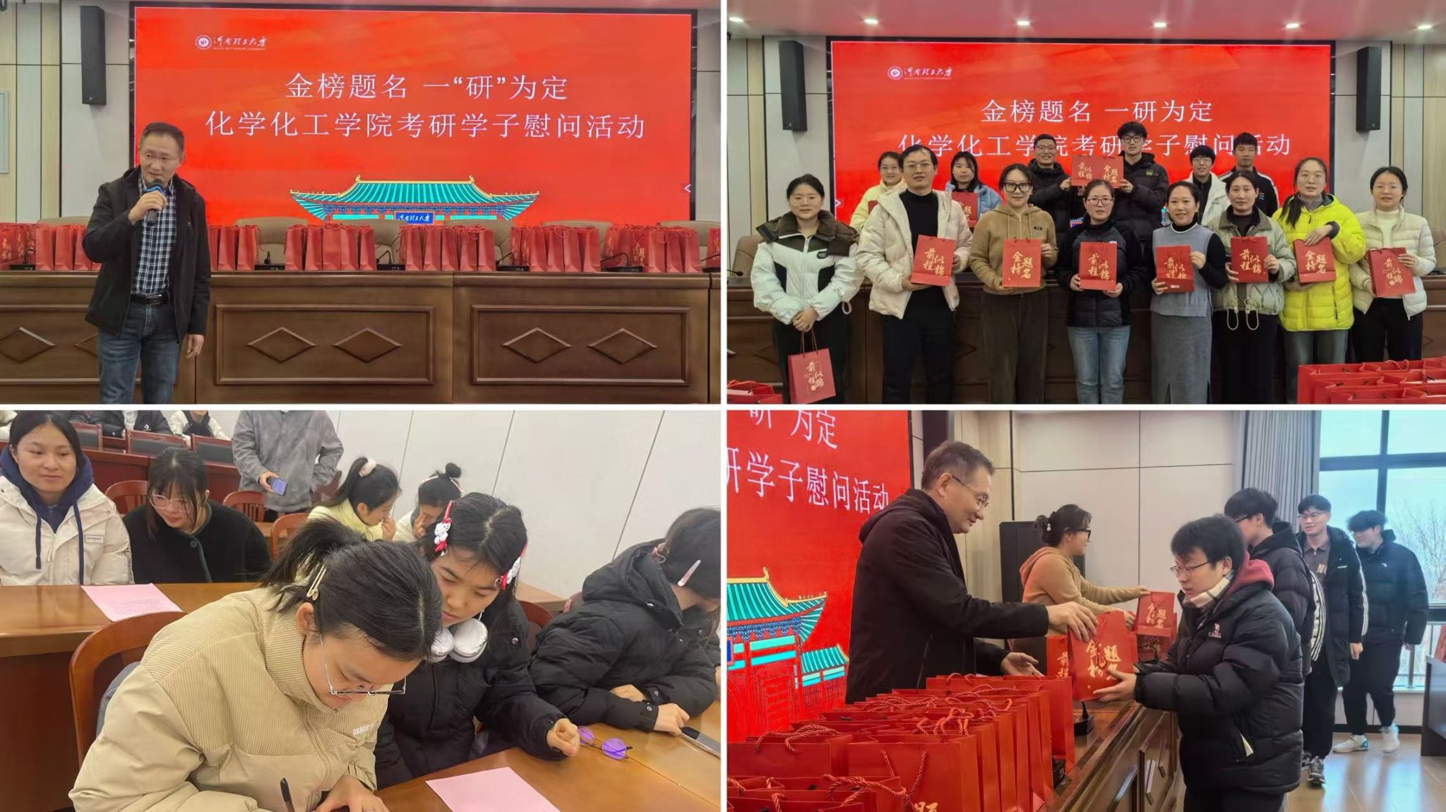为了鼓舞考生士气,缓解考前压力,坚定考研信心。我院于12月17日下午在综合实验楼507开展考研慰问系列活动,我院党委书记张传祥、副书记王楠、全体专兼职辅导员以及全体21级考研学生参加本次活动。