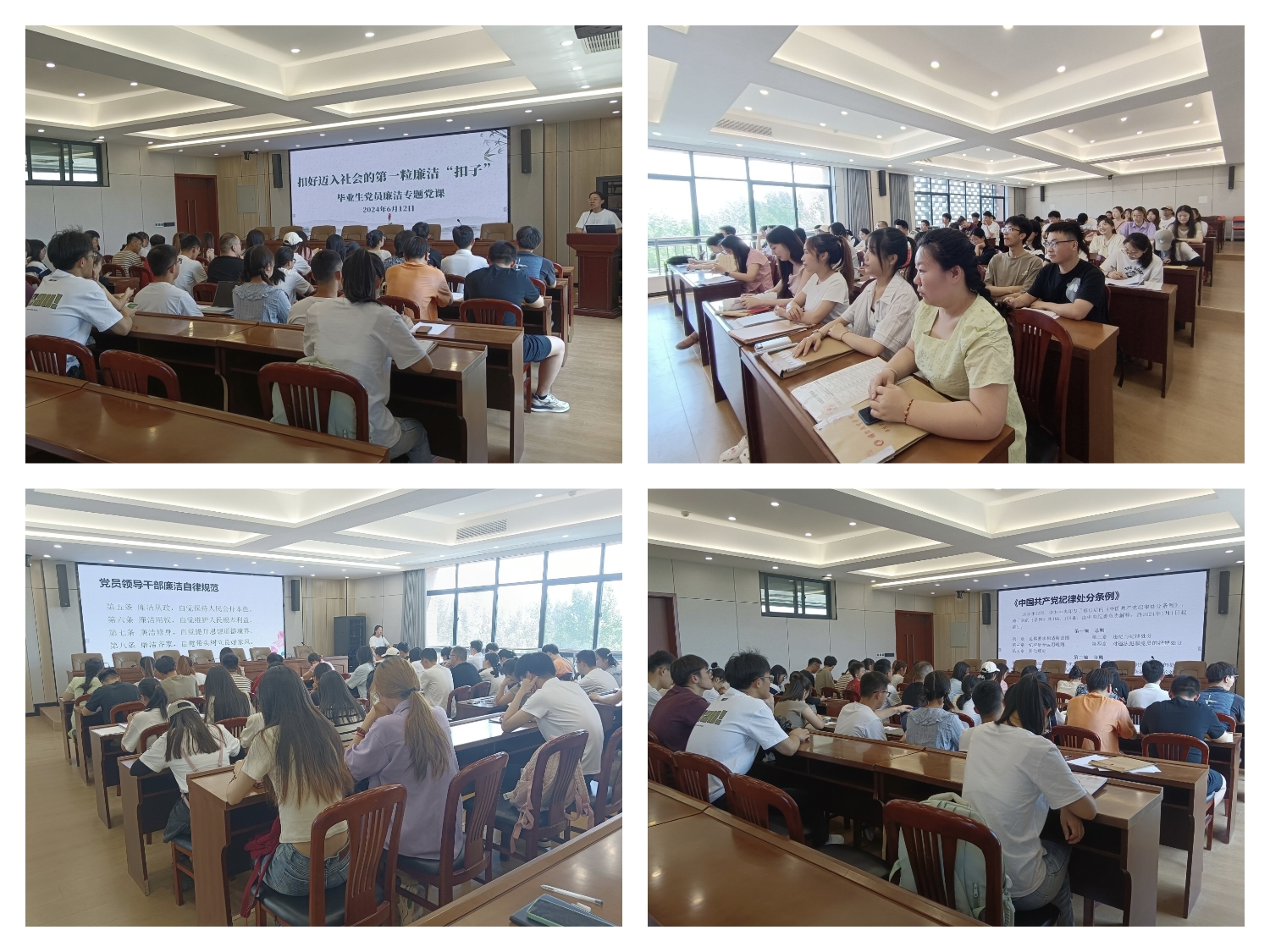 为深入学习贯彻习近平新时代中国特色社会主义思想和党的二十大精神,进一步强化毕业生党员廉洁意识和规矩意识,引导毕业生党员遵纪守法、崇廉诚信。学院于6月12日在综合实验楼507会议室开展2024届毕业生党员廉洁专题党课。学院专职组织员崔敏老师为学院全体毕业生党员讲“扣好迈入社会的第一粒廉洁‘扣子’”专题党课。